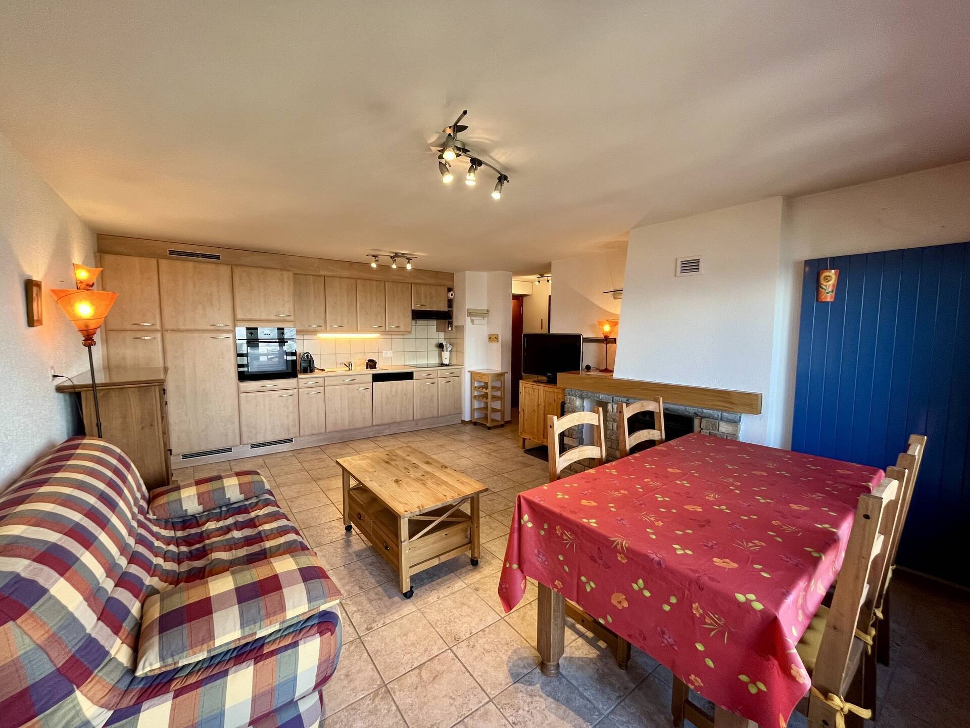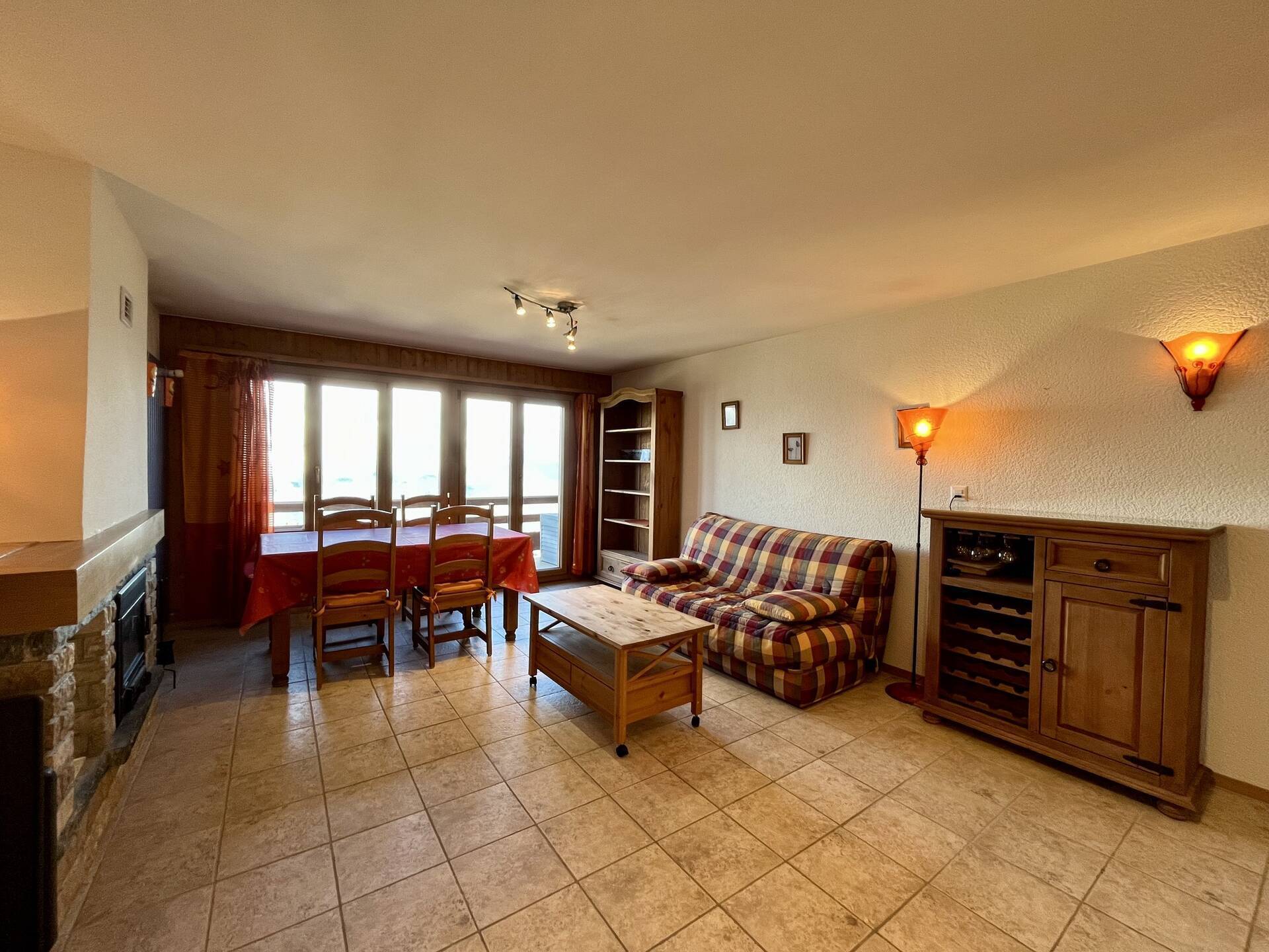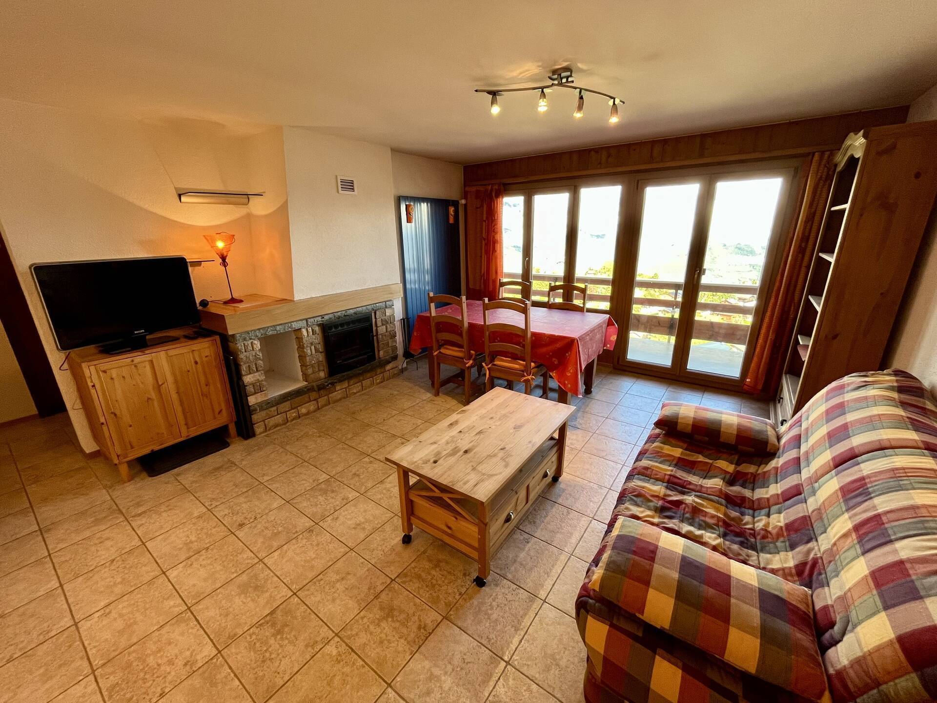 2-room apartment, 4 people, 50m2, type D with indoor swimming pool in the building, living room with cable TV, Wifi, and 1 sofa bed for 2 people, 1 kitchen with sink, ceramic hob, fridge, large freezer, microwave. 1 Chimney 1 bedroom with 1 large bed for 2 people (mattresses side by side), 1 bathroom with shower, sink and toilet. 1 north balcony. Quiet location, magnificent view of the resort and the Alps, 300m from the resort center, shops, shuttle bus and funicular to the cable car. Shared outdoor parking in front of the building.