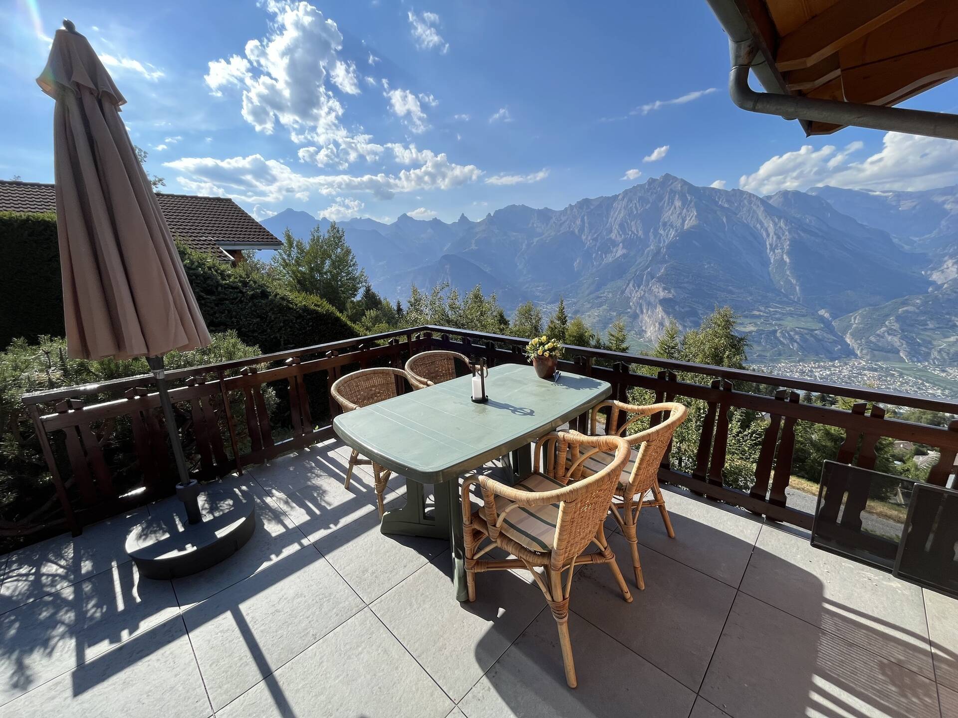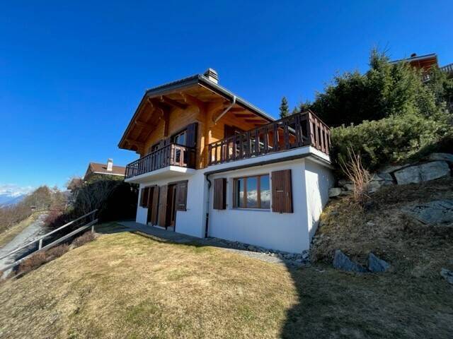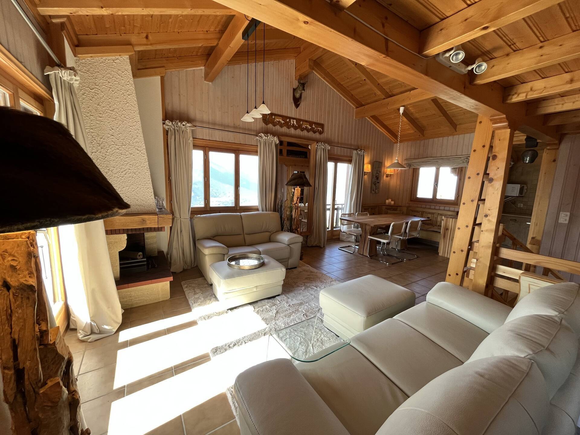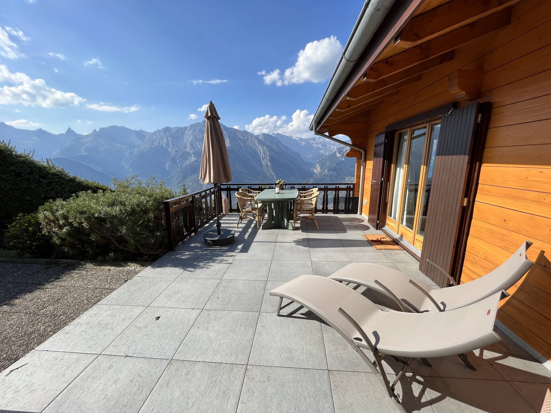 Chalet très sympathique, 4 pièces pour 6 personnes, 100m2, vue imprenable sur la vallée, ensoleillé et calme. A l'étage : sas d'entrée, 1 WC séparé, 1 grand séjour, TV et Wifi, coin à manger, cuisine bien agencée, ouverte et équipée avec lave-vaisselle, 4 plaques de cuisson, 1 frigo, micro-ondes. 1 mezzanine. Au rez de chaussée : 1 salle de bain avec douche, lavabo et WC, 1 chambre avec 1 grand lit pour 2 personnes, 2 chambres avec 2 lits côtes à côtes, 1 salle de bain avec baignoire, lavabo et WC. 1 grande terrasse extérieure avec jardin, 1 place de parc extérieure, hiver bus navette gratuit à 100m. A 900m des remontées mécaniques, des pistes de ski et des commerces. Situation tranquille et ensoleillée. Vue magnifique sur les Alpes et la Vallée du Rhone.